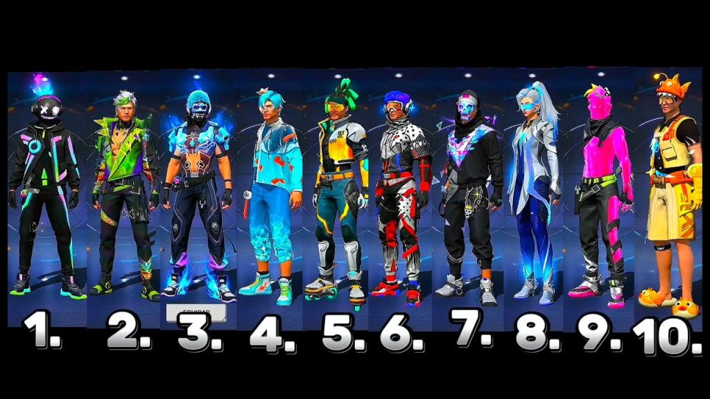 - Trajes completos de personaje (Sets): Conjuntos de skin para personaje que incluyen atuendo, mochila, mascota y arma con una temática cohesionada y a menudo con efectos de movimiento o habilidad visuales únicos.